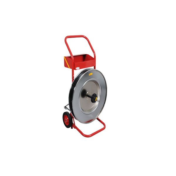 Dispenser to suit 12mm - 19mm Rope Wound Steel Strapping. Comes with wheels for ease to move around, a tray for putting tools and seals in and a spring brake to control the feed of strap when being dispensed. Core size 400mm, Outer Diameter 650mm.