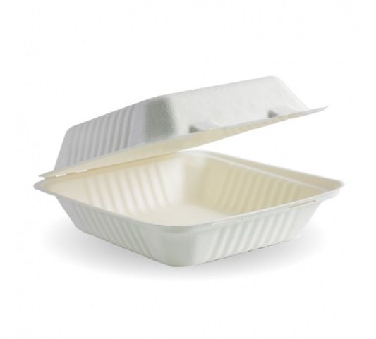 These rectangular white clamshells are perfect to fit a long sandwich or a burger with a side of fries, are tree-free and made from reclaimed sugar cane pulp. The grease and water resistant packaging is both microwave and refrigerator safe. Compostable