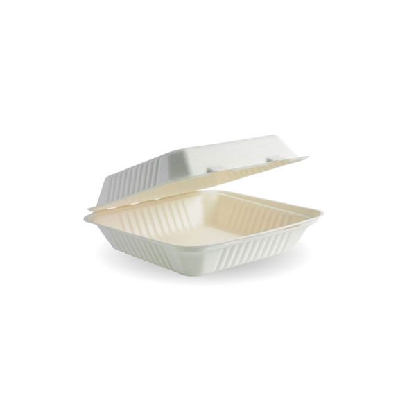 These rectangular white clamshells are perfect to fit a long sandwich or a burger with a side of fries, are tree-free and made from reclaimed sugar cane pulp. The grease and water resistant packaging is both microwave and refrigerator safe. Compostable