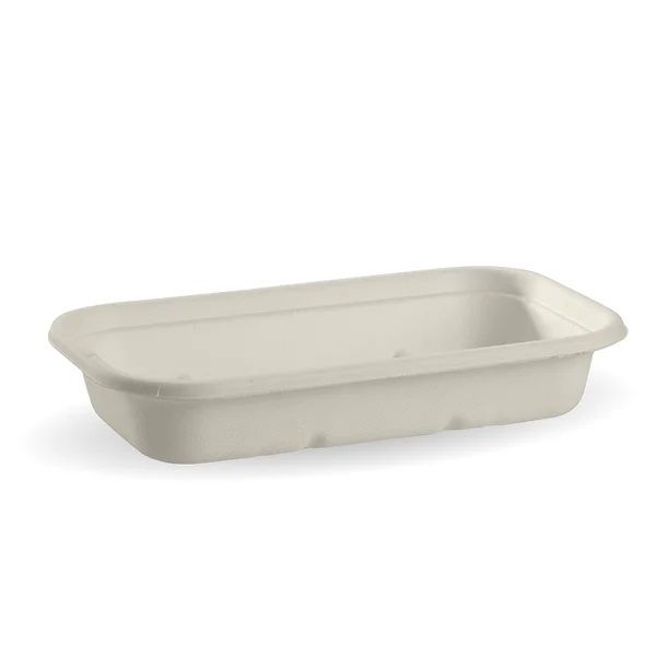 This rectangular white takeaway tray is plastic free and made from renewable sugarcane pulp. This product is both microwave and refridgerator safe. Compostable. Compatible lid refer product 361BLBLPLAD.
