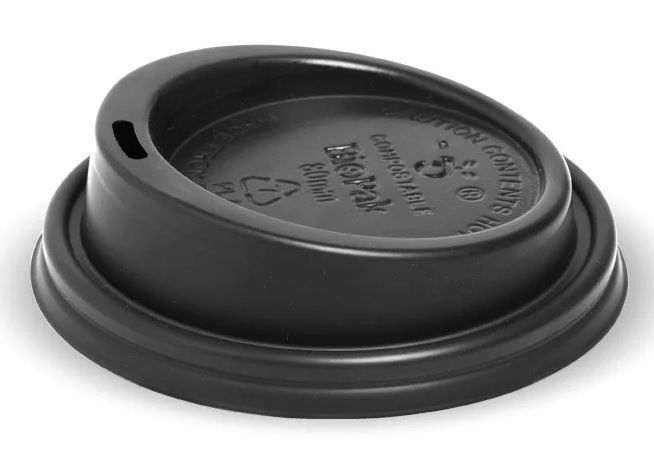 These lids are made from Ingeoâ„¢, an ingenious bioplastic made from plants not oil. These black lids fit the 80mm diameter Bio Cups. These PLA lids are certified commercially compostable.