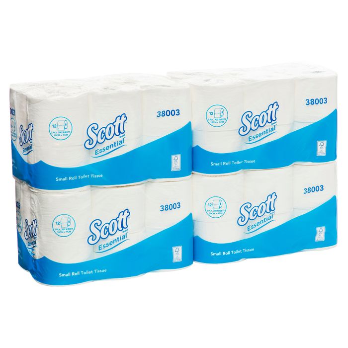Scott Essential 2 ply toilet roll, 700 sheets per roll, 48 rolls per carton.