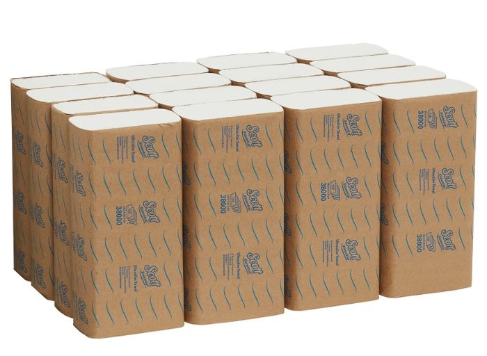 Interleaved paper hand towel measuring 24cm x 21cm. 150 sheets per pack, 16 packs per carton.