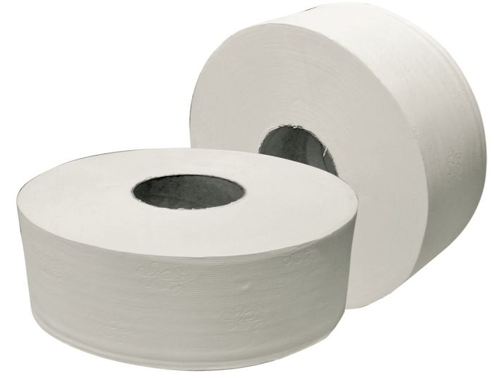A 2 ply Jumbo Roll of Toilet Paper. Floral Embossed, Deluxe. 300m per roll, 8 rolls per carton.