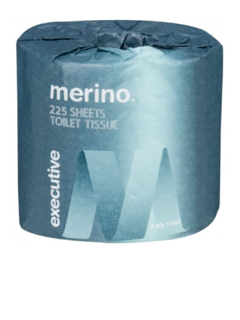 Merino M1301 Executive Toilet Rolls. White in colour, 3 ply paper and individually wrapped. There is 225 sheets per roll and 48 rolls per carton.
